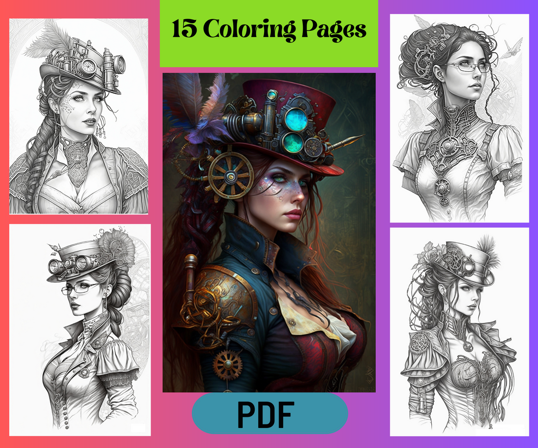 Looking for a unique coloring experience? Look no further than these Victorian steampunk women's grayscale...