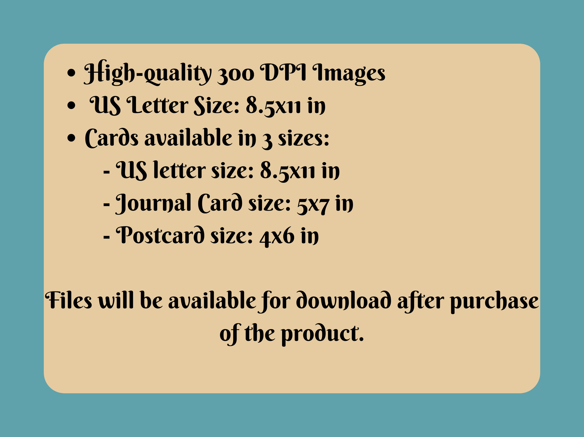 - Post Card Size: 4x6 in - Colored versions are also available in US letter size.
