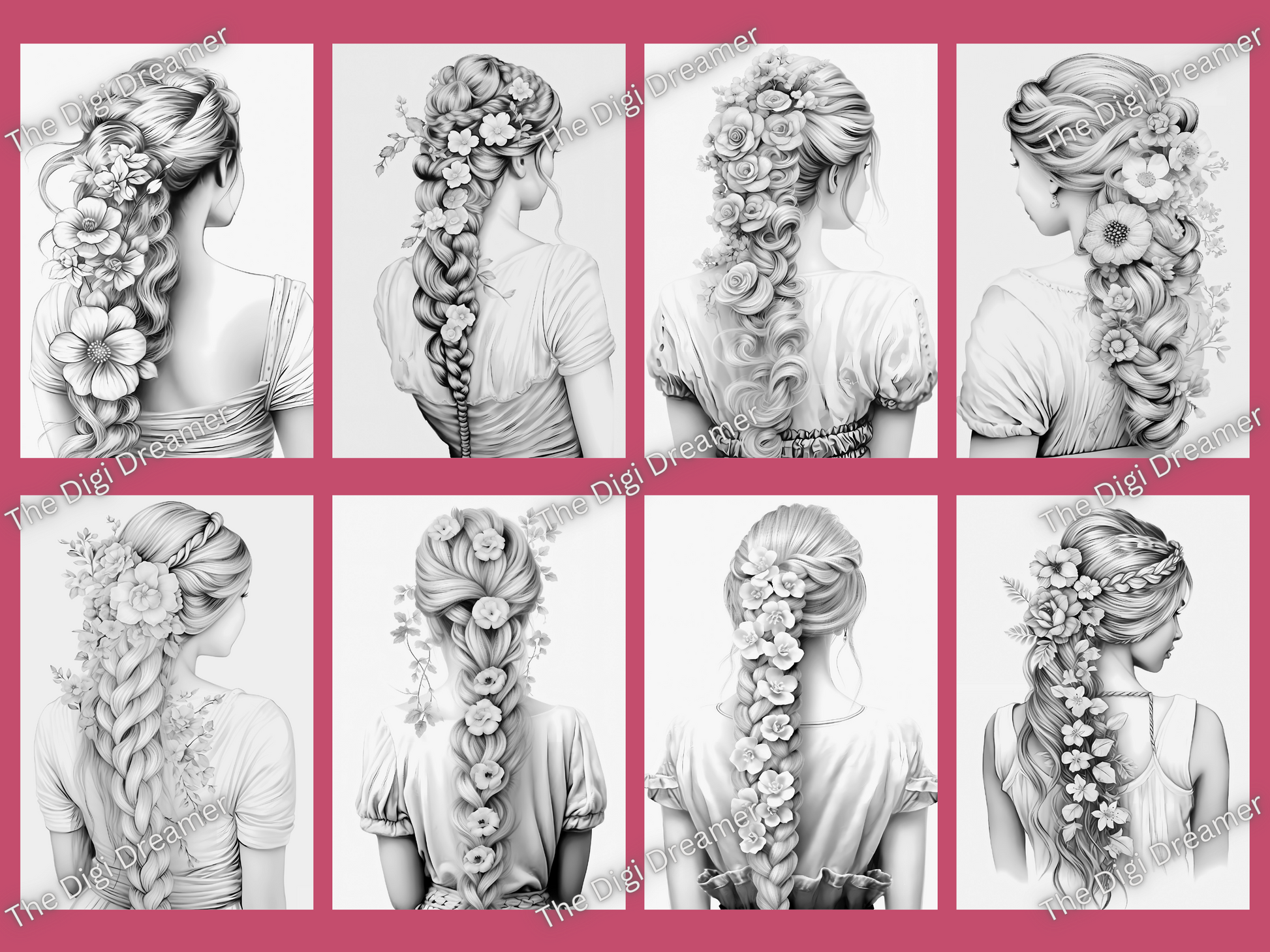Flower Braid Hairstyles Grayscale Coloring Pages for Adults & Kids